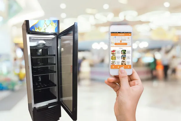 The vending machine also comprises of a tablet device which on a successful QR code scan allows the users to open the vending machine and select the products ordered from its App. If the wrong product is selected a buzzer is rung and also allows the user to purchase if needed.